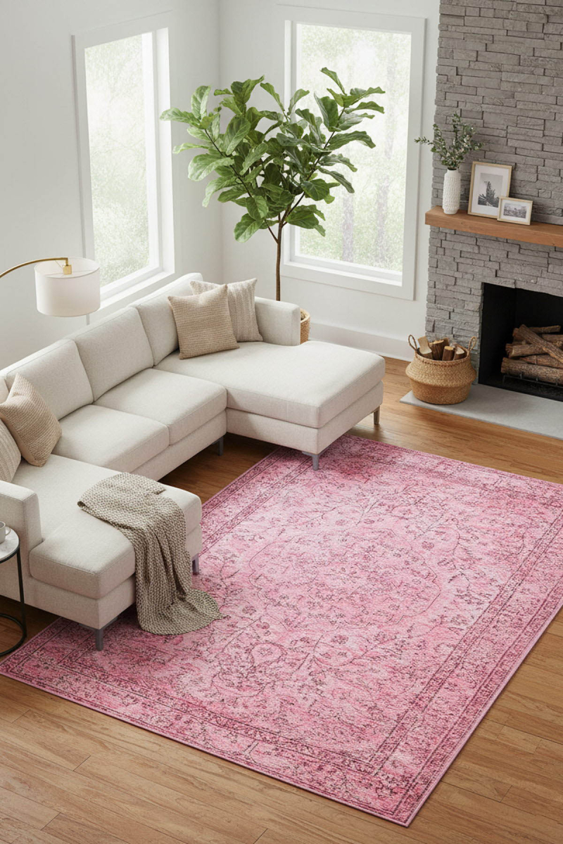 Dorian Eskitme Desenli Dokuma Taban Dekoratif Pembe Halı AL 137