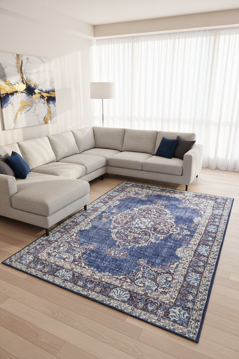 Blues Vintage Desenli Dokuma Taban Dekoratif Lacivert Halı AL 249