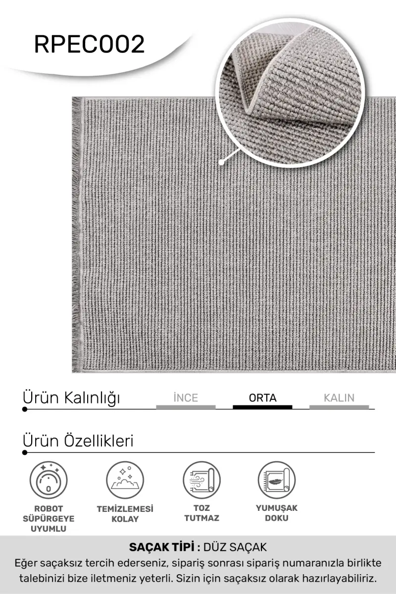 Evo Gri Robot Süpürgeye Uyumlu Kolay Temizlenebilir Halı Oturma Odası, Mutfak, Koridor Halısı RP 55