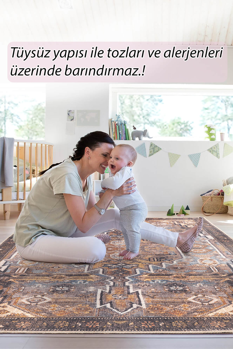 Folk Etnik Desenli Dokuma Taban Dekoratif Kahverengi Halı BA 01