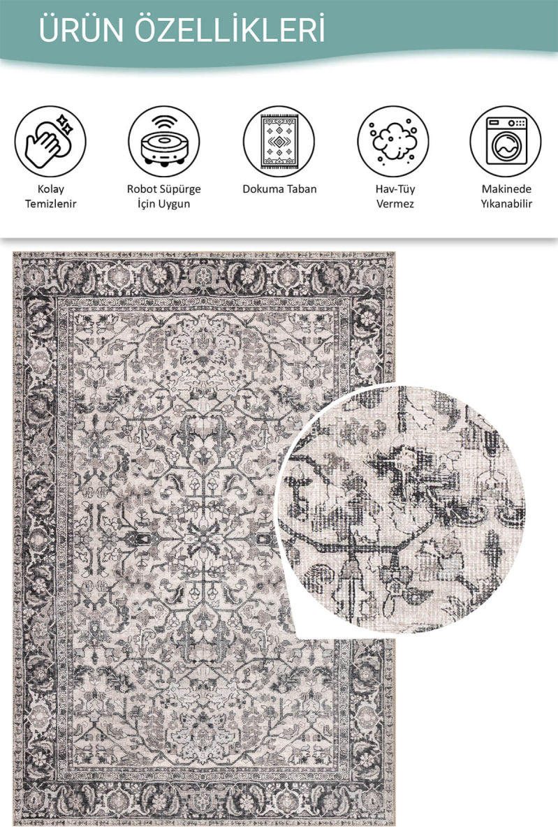 Outlet 150x230 Stonart Eskitme Vintage Desenli Bej/Gri Otantik Yıkanabilir Şönil Halı AL-458