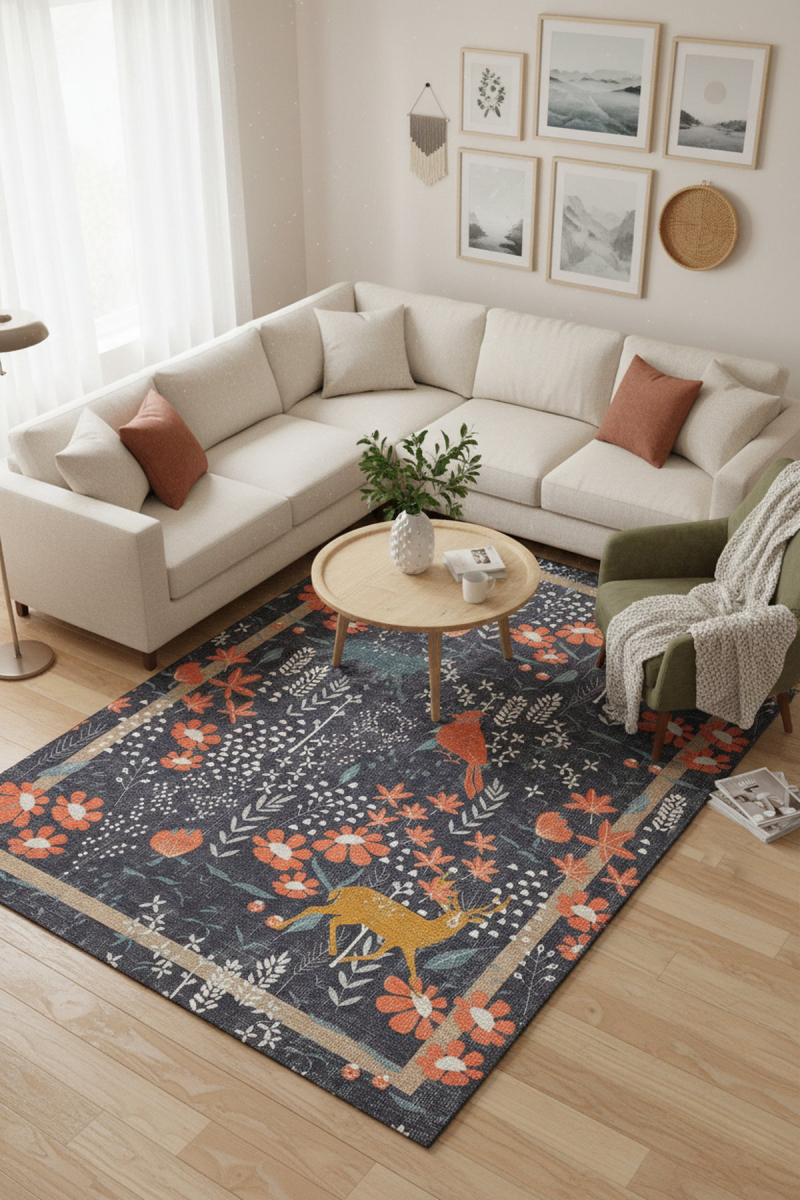 Outlet 210x210 Kare Florart Lacivert / Turuncu Doğa Temalı Çiçekli Dokuma Tabanlı Modern Şönil Halı AL-480