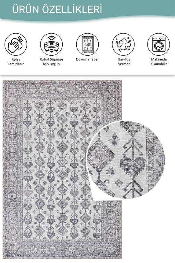 Stonart Eskitme Vintage Desenli Bej/Gri Otantik Yıkanabilir Şönil Halı AL 448
